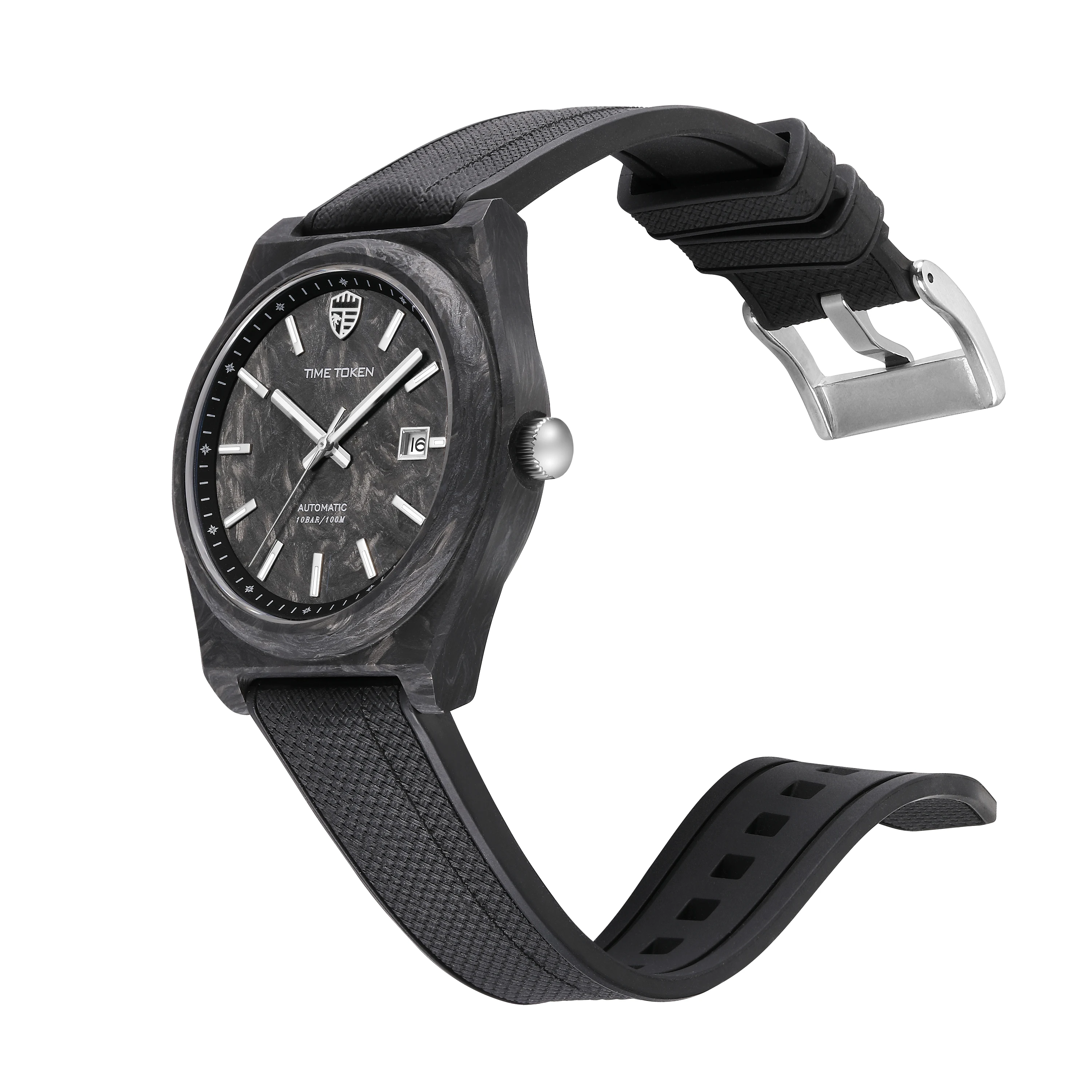 This watch is powered by the 2831 automatic movement, which offers increased magnetic resistance and stability.The forged carbon watch comes with a black rubber strap with a pin buckle with a quick-release system